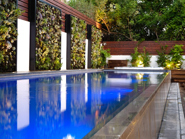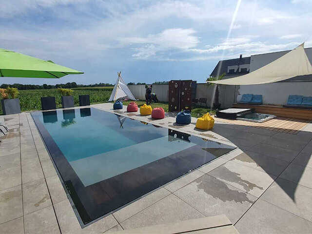 La piscine à débordement est conçue pour donner l’illusion que la piscine fait partie intégrante du paysage environnant, elle est parfaite pour les terrains en pente. La hauteur d’au moins un des cotés est plus basse que les autres. La surface de l’eau du bassin se confond avec la ligne d’horizon, la connexion entre le ciel et l’eau. C’est un bassin très esthétique qui laisse une sensation d’infinie et de grandeur. Vous avez l’impression de nager jusqu’à l’horizon.