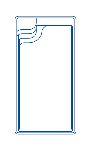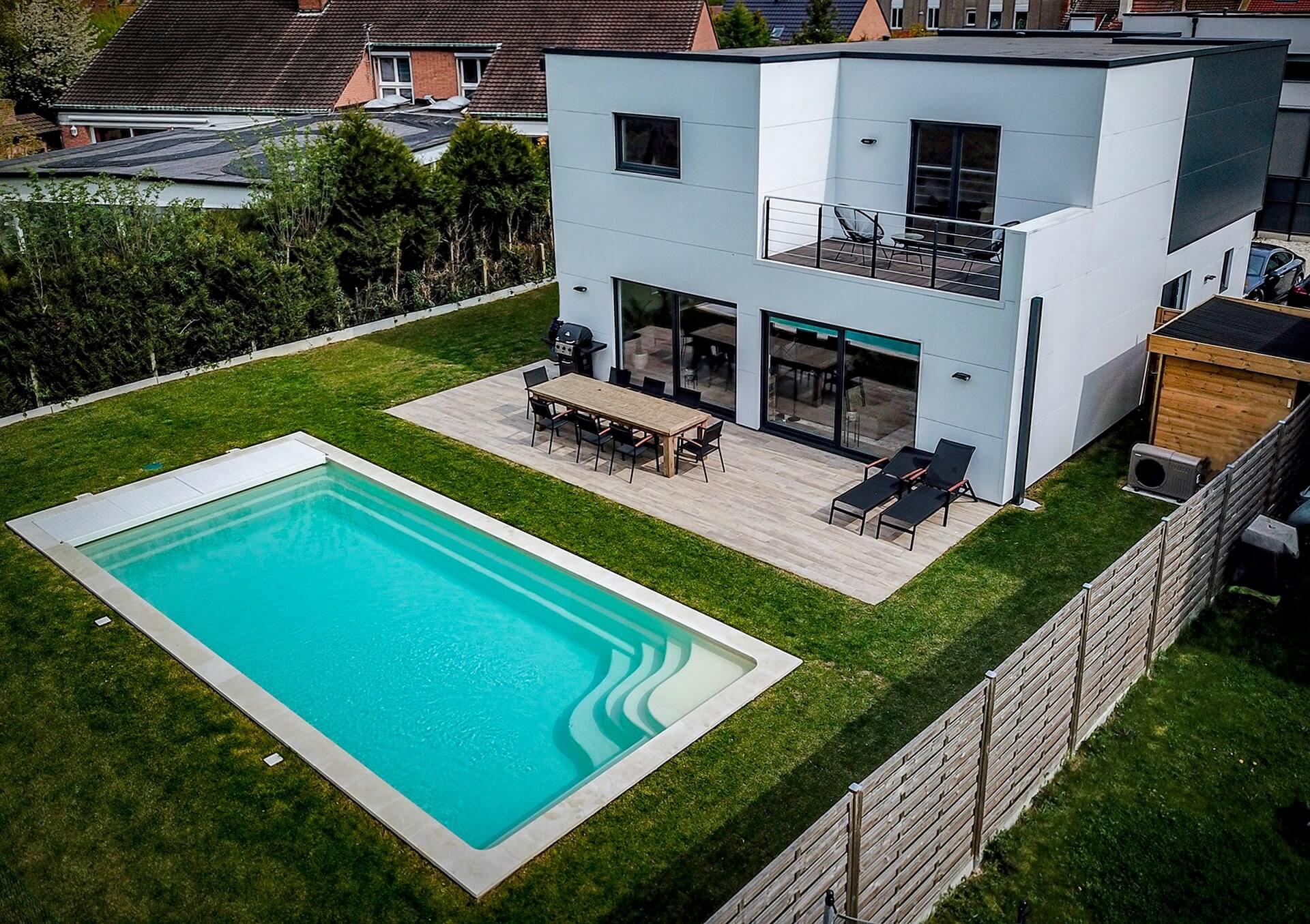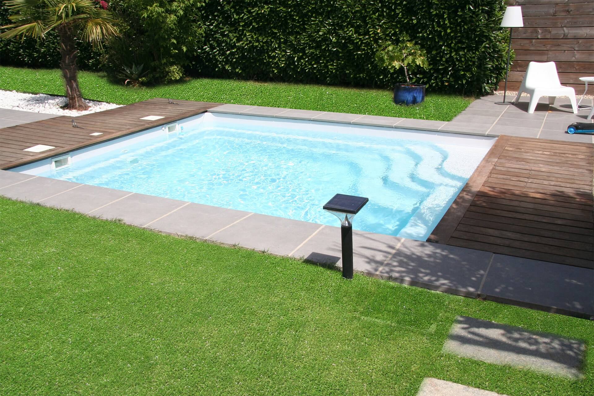 L’élégance intélligente. La piscine rectangulaire modèle UNIQUE à fond plat, coque polyester de la marque MON DE PRA.